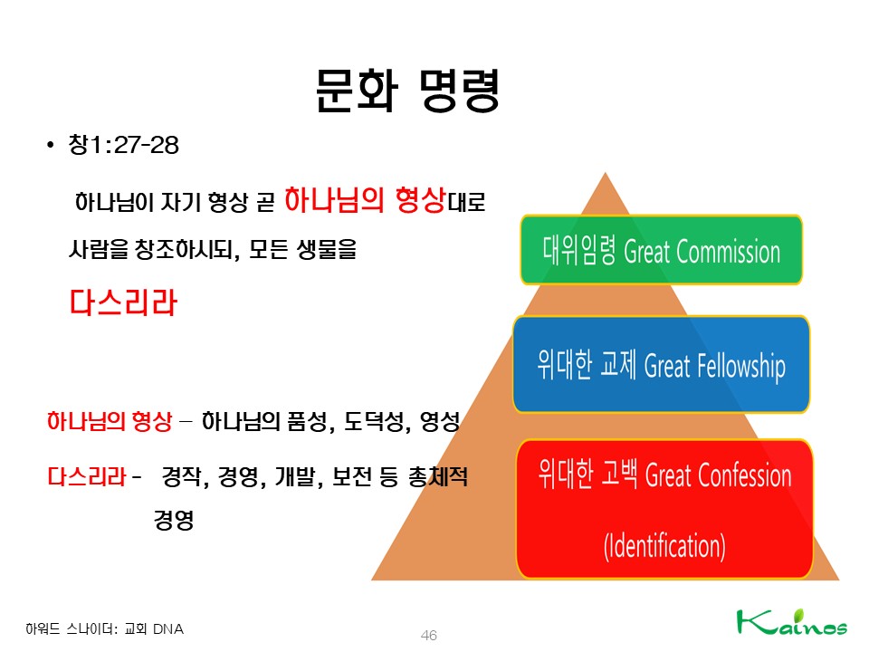 그리고 창세기 1장 27-30절에 하나님께서 하나님의 형상대로 사람을 창조하신 뒤에 사람에게 주신 명령이 있습니다. 생육하고 번성하여 땅에 충만하고 모든 생물을 다스리라는 명령이죠. 이를 문화 명령이라고 합니다. 사람을 '하나님의 형상'대로 창조하셨다고 할 때 형상은 외모를 의미하는 것이 아닙니다. 오히려 하나님의 품성, 도덕성, 영성 등 내적인 요소를 우리에게 심어주셨다는 겁니다. 모든 선함의 원천이자 출처인 하나님의 형상으로 세상을 총체적으로 경영하라고 당부하십니다.