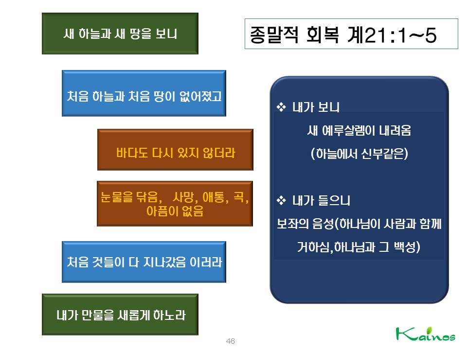 이 문단은 X 교차구조 또는 수미상관 구조를 갖기에 전후의 문장이 서로 짝을 이루며 의미를 강화합니다. 새 하늘 새 땅이 임할 때 만물이 새롭게 되고 처음 것들이 다 사라집니다. 이때 바다라는 이미지로 상징되는 우리를 힘들게 하던 모든 부정적인 것들 즉, 눈물, 사망, 애통, 곡하는 것과 아픔이 사라집니다. 그리고 환상과 음성이 보이고 들립니다. 하나님께로부터 하늘에서 신부처럼 단장한 새 예루살렘이 내려 오는 것이 보이고, 하늘에서 들리는 음성에 따르면 하나님이 그 백성과 함께 계시고 그들은 하나님의 백성이 된다고 선포하십니다. 그리스도의 신부인 교회가 창세 이래로 갈망하던 결혼식이 이뤄지는 겁니다. 그리고 창세이래로 오래고 오랜 약속, 우리는 그의 백성이 되고 그는 우리의 하나님 되신다는 이 약속이 드디어 성취됩니다.